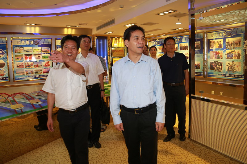 图1:自治区党委常委、自治区常务副主席黄道伟等领导到集团公司视察。前排左起:集团公司董事长朱坚和,自治区党委常委、自治区常务副主席黄道伟,自治区国资委主任管跃庆,自治区交通运输厅副厅长梁毅