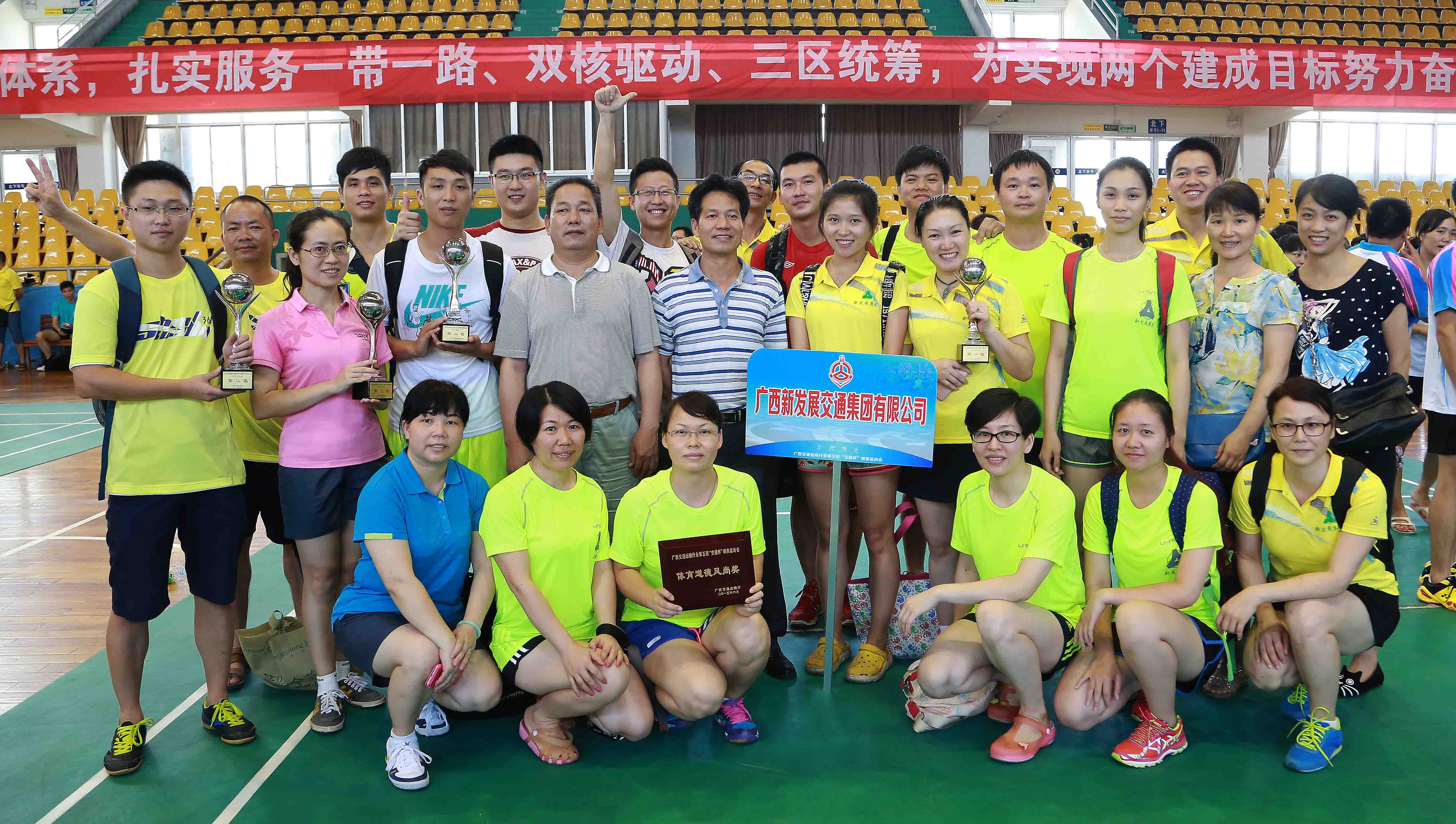 6月26-28日,广西交通运输行业第五届“交通杯”球类运动会在广西体育馆举办,共有27个单位、企业参加了本届运动会。我集团公司朱坚和董事长、党委书记为团长,刘明洪、张友坐、邓远志、覃炳贤等领导班子成员为副团长,率团参加运动会。集团公司代表团(70余名运动员)在连续3天的运动会日程里,参与了男子篮球、气排球(男子组、女子组)、乒乓球(男子团体、女子团体)、羽毛球(男子团体、女子团体)等比赛项目竞技,并获得优异成绩。