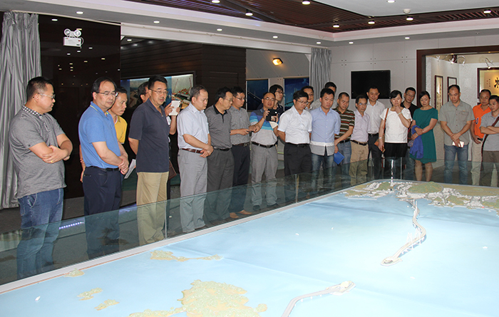 在港珠澳大桥管理局展厅,管理局苏权科总工程师向考察团介绍了港珠澳大桥建设背景、工程概况、技术难点、工程进展等情况。集团公司学习考察人员就工程建设管理模式、防灾减灾设计、耐久性设计、沉管对接方案、人工岛筑岛工艺等问题与大桥项目管理人员进行了探讨交流。