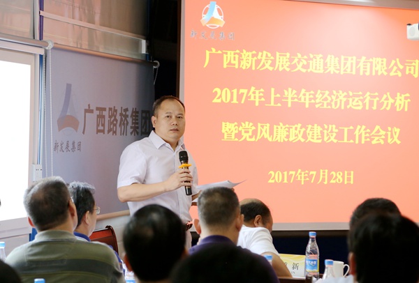 7月28日,集团公司在南宁市柳南高改快3标项目召开2017年上半年经济运行分析暨党风廉政建设工作会议。会议传达了交通运输部2017年上半年工作总结和下半年工作会议精神,全区县域经济发展大会暨年中工作会议精神以及自治区国资委2017年上半年经济运行分析、安全生产暨“1+N监督闭环”工作推进会议精神,对集团公司上半年经济运行情况和党风廉政建设工作情况进行了认真总结与分析,研究部署了下一阶段工作任务。会议由集团公司党委副书记、副董事长、总经理唐咸秋主持。