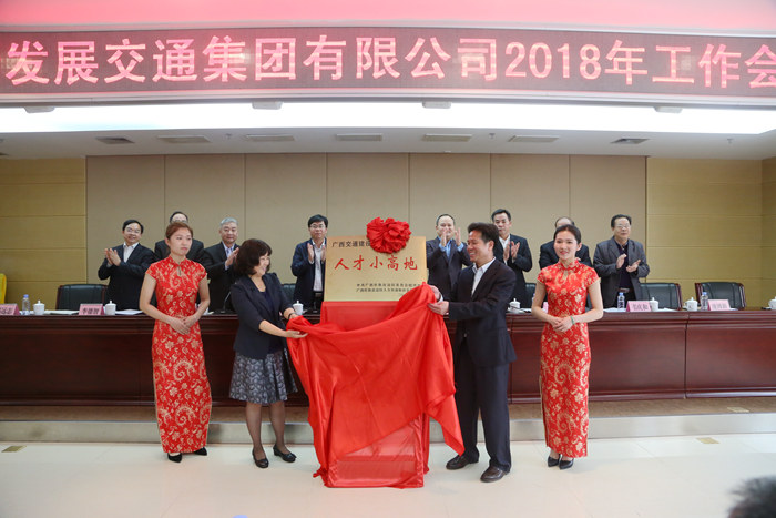 会后,自治区国资委副巡视员巩学青与集团公司党委书记、董事长朱坚和一同为集团公司“广西交通建设人才小高地”揭牌。